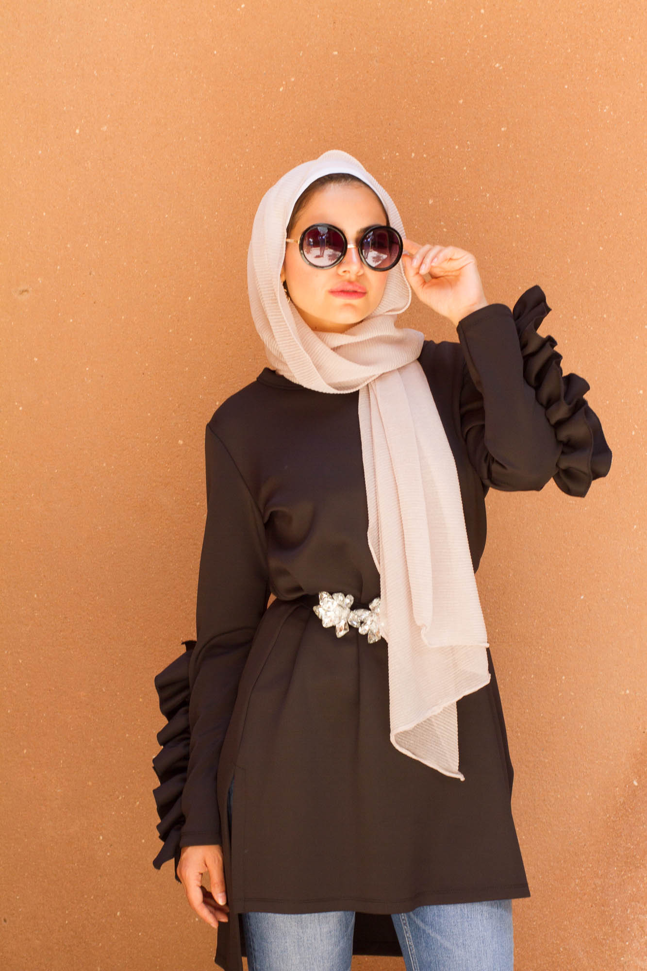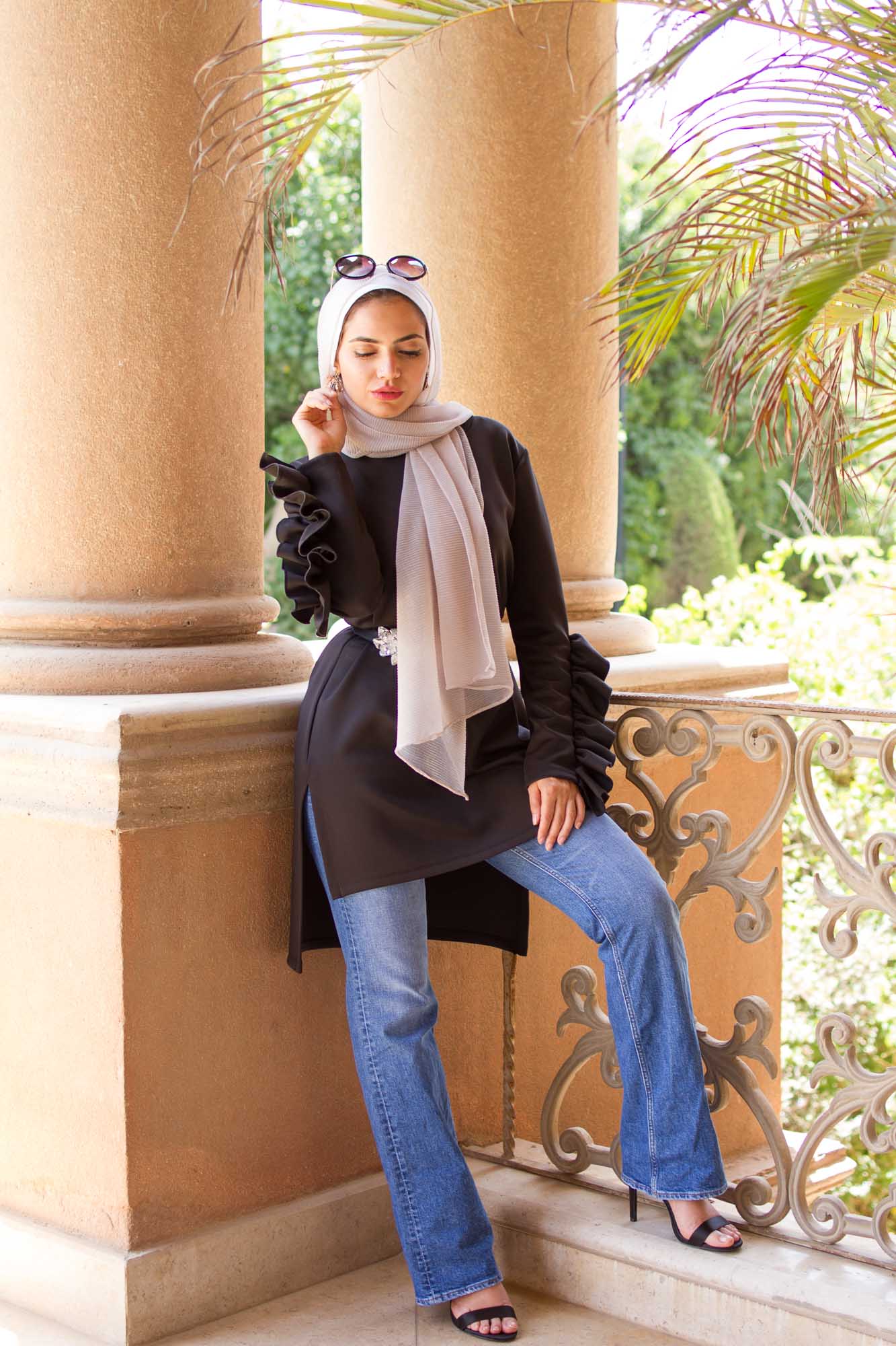 Scarf: EMMA Pebble Shimmer– Elbow Ruffle Top: Aneeqa Designs – BootCut Jeans: H&M – Satin Heels: Mango – Sunnies: Miu Miu