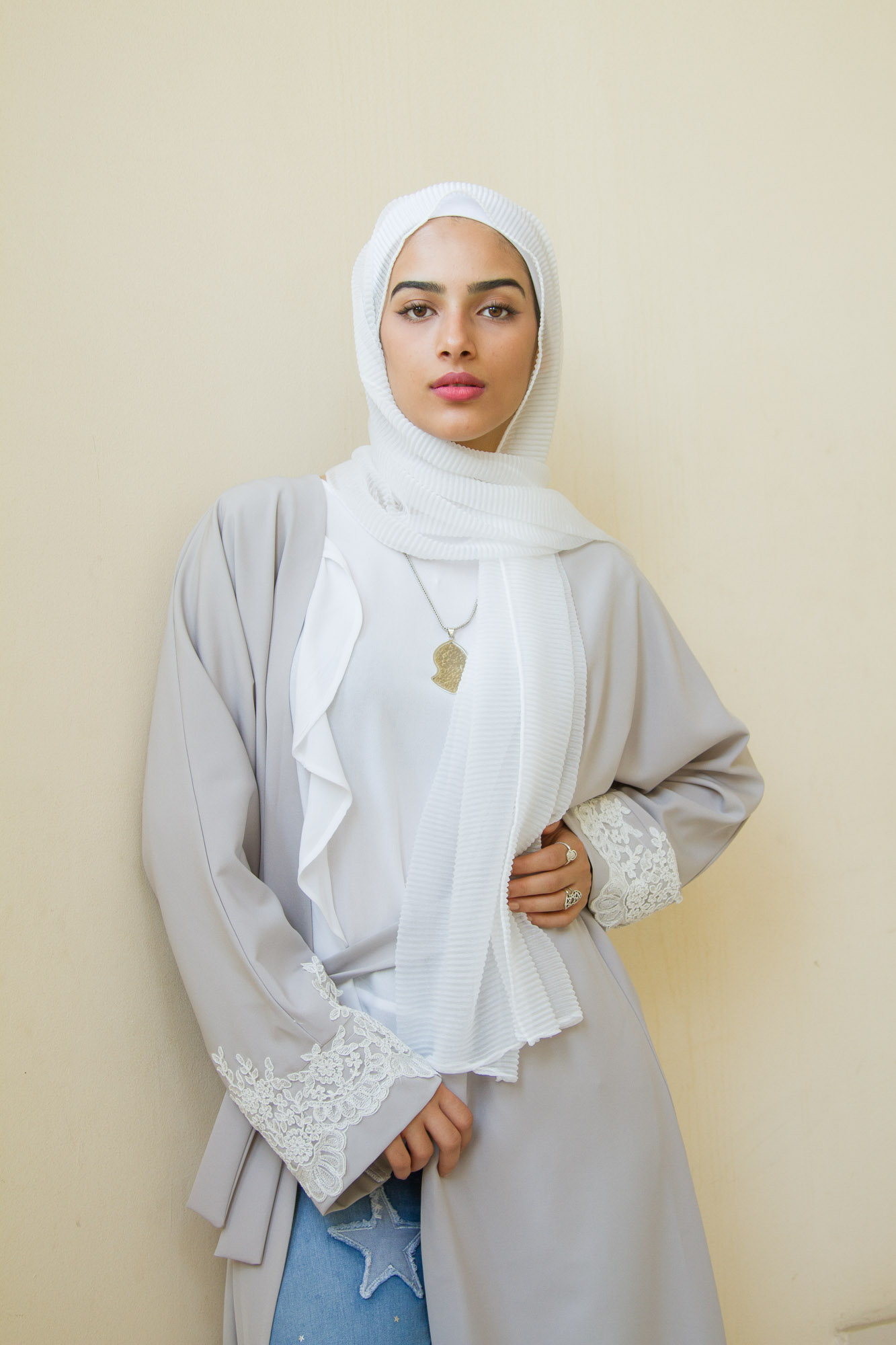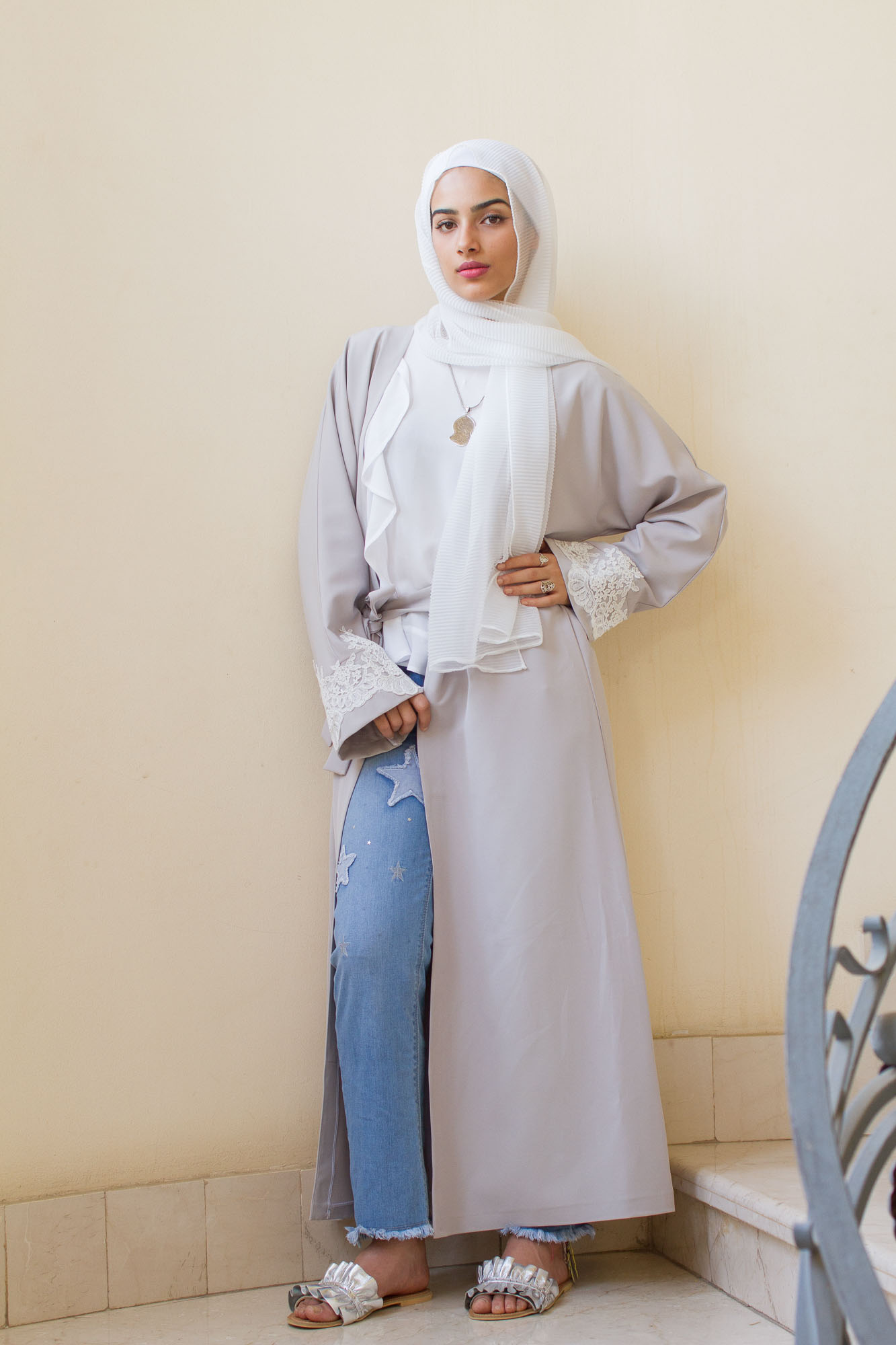 Scarf: EMMA Ivory Shimmer – Grey Embroidered Kaftan: Meem Designs – Zeina Star Jeans: Heya Designs – Silver Ruffled Slippers with Studs: Pellame – Accessories: Sandal line from Maison Lashin – Top: Mango.