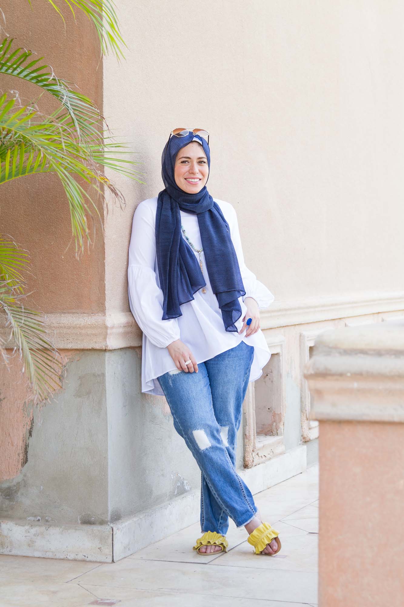 Scarf: EMMA Navy Shimmer– Top: Threads by Sara – Jeans: Noisy May – Yellow Ruffled Slippers with Studs: Pellame – Sunnies: Dior – Prayer Beads/Necklace: Maison Lashin