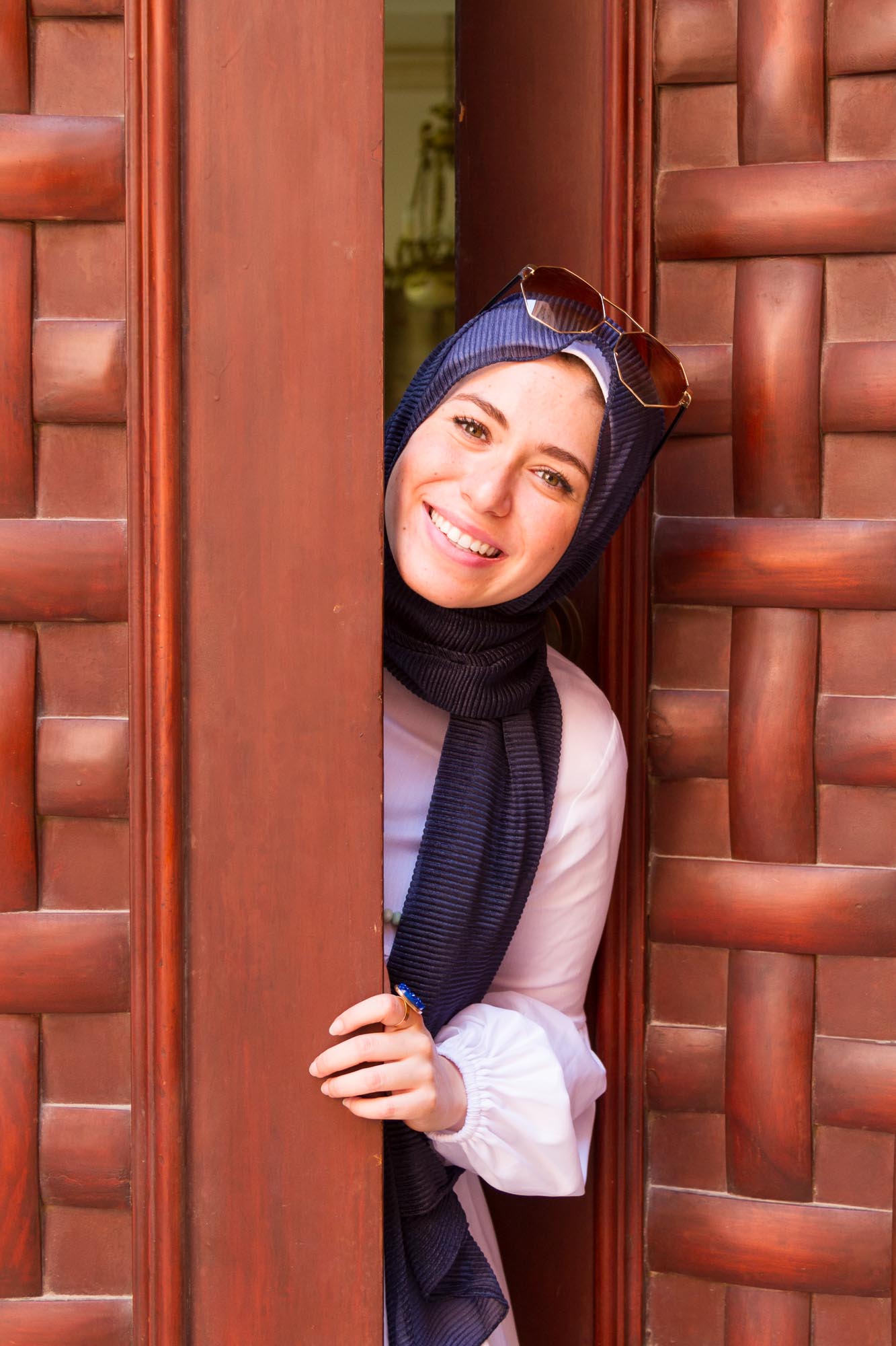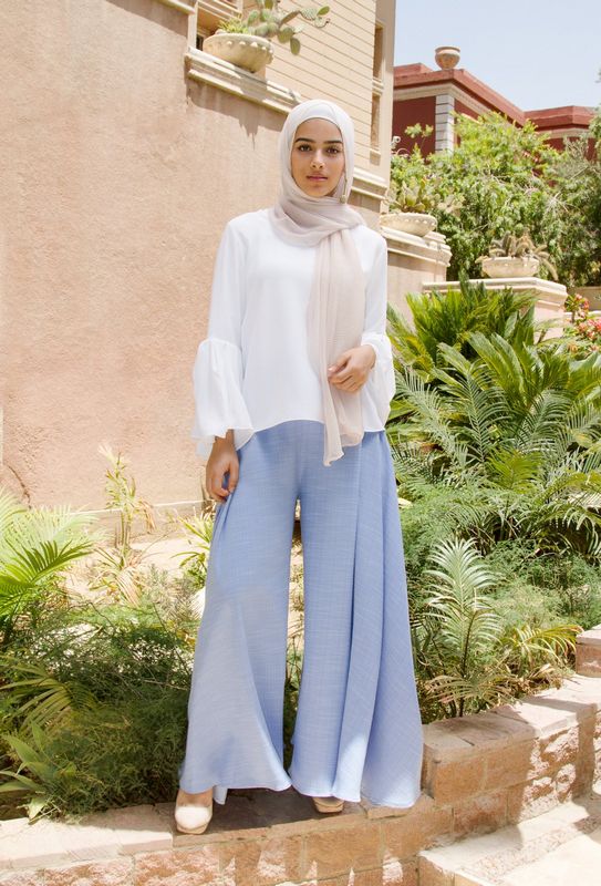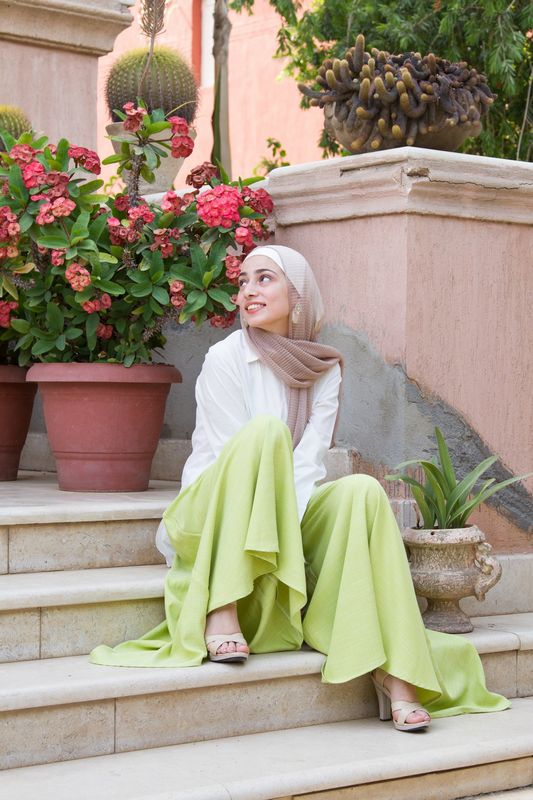 Scarf: EMMA Onyx Shimmer– Silk Kimono & Bell Sleeve Blouse: Massimo Dutti – Pants and Pointed Kitty Heels: Zara – Accessories: Sandal line from Maison Lashin.