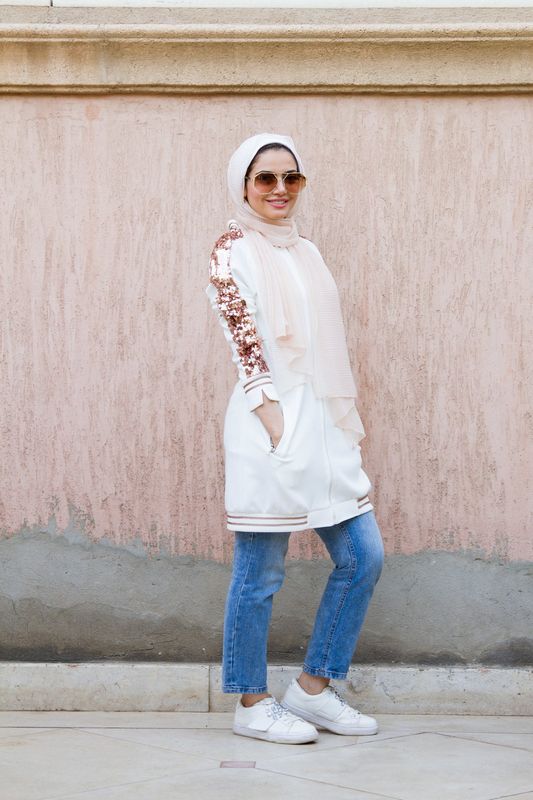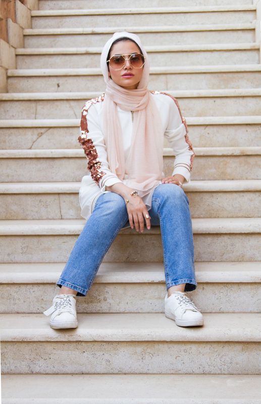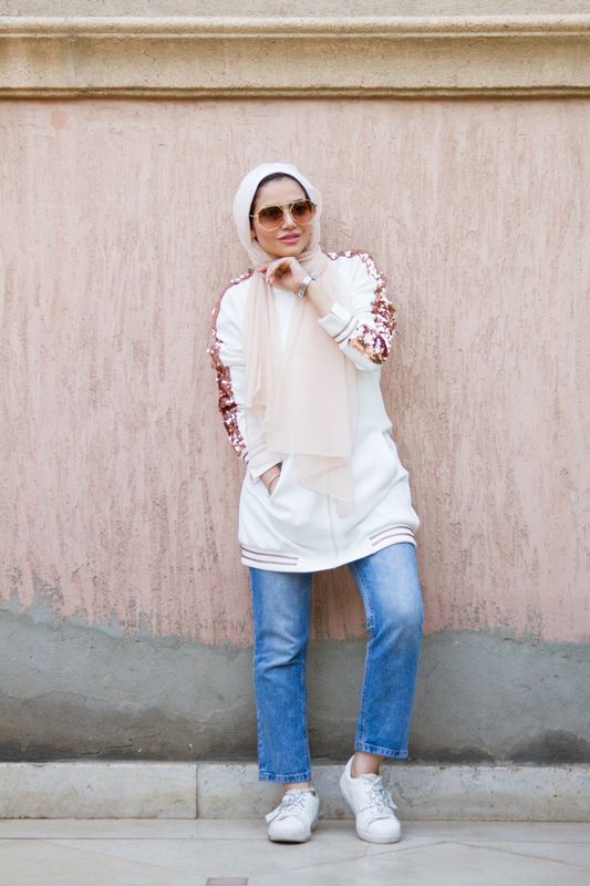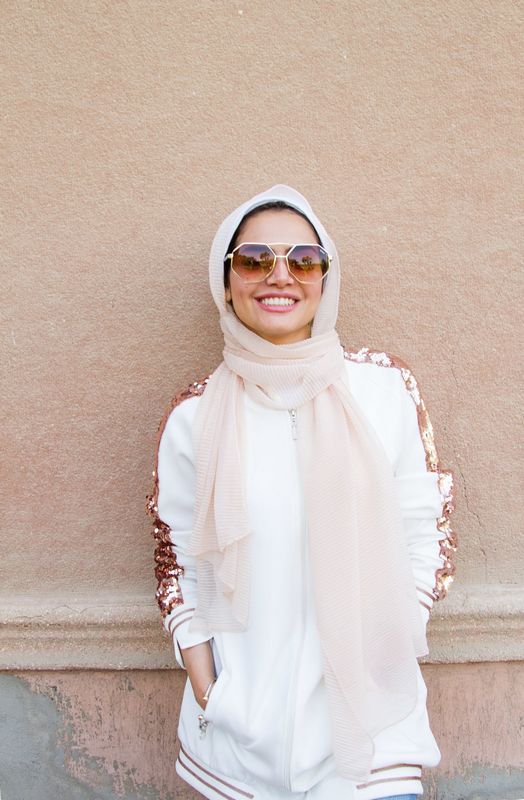 Scarf: EMMA Mink Shimmer– Sequined Bomber: Aneeqa Designs – Straight Cut Jeans: H&M – Jeweled Sneakers: Aldo –Sunnies: Dior