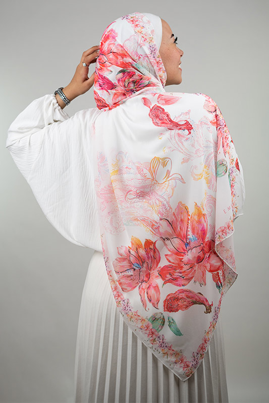 Fairy Blossoms is one of EMMA’s most delicate hijabs. It’s a white hijab covered with large dainty flowers and bordered by a floral edge. The flowers are in various shades of pink, making the hijab perfect to wear with literally anything pink. It’d also look bold in a fun way with yellow clothing like the model is wearing in this picture.