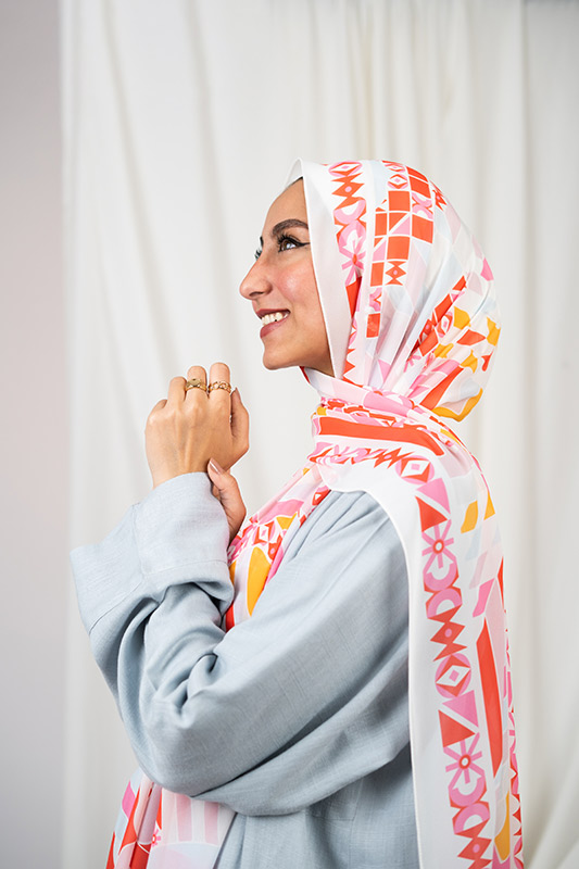 If you want to revive the 90s vibes, there’s no better way to do so than wearing a hijab like Retro Fusion. It features a unique blend of orange and pink on a white background, looking like something out of a 90s magazine.