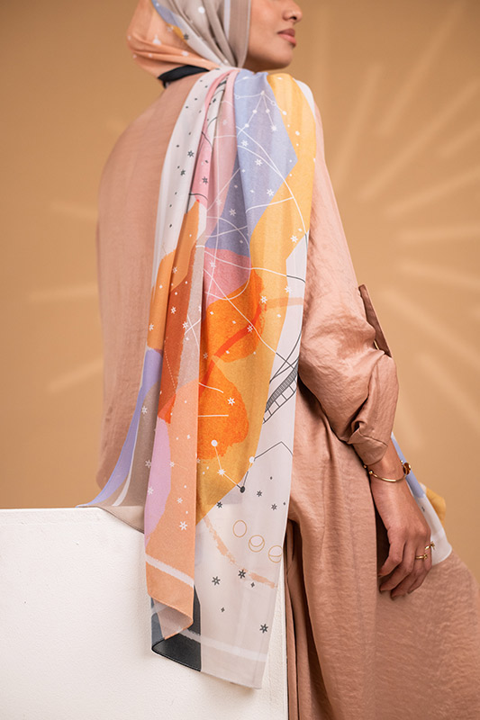 From the same collection as Stardust, Stellar is a celestial-inspired hijab that looks like the heavenly skies. It features plenty of pastel shades, adorned with small sparkles looking like stardust. It also dons some patterns looking like real constellations.