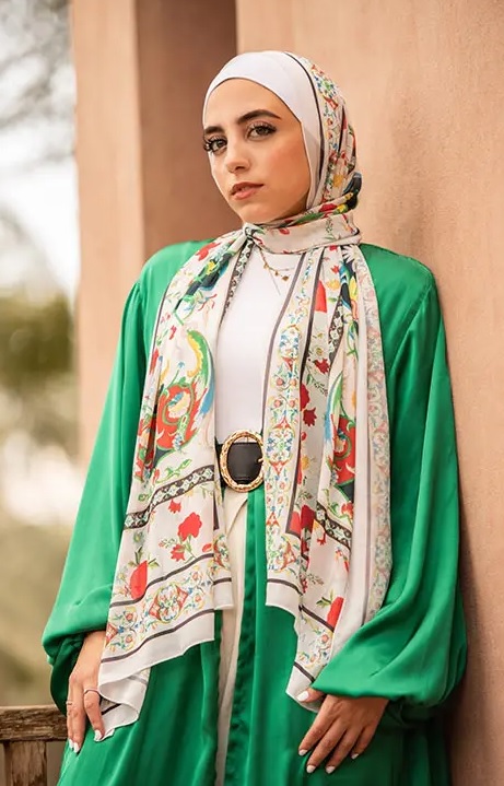 The hijab features plenty of colors, including green, red, brown, and yellow. You can wear it with any of these colors, along with beige, sage, and earthy colors.
