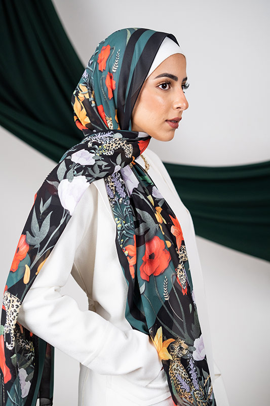 Leo Diva isn’t for the faint-hearted. It’s a bold, powerful hijab that gives you a captivating aura. The hijab has a black background bordered by a deep green edge. It features large flowers in bold colors like red and white. On top of that, it sports some exotic drawings along with the flowers, like a cheetah and some green stalks.