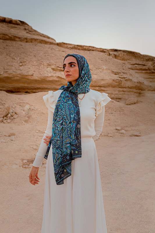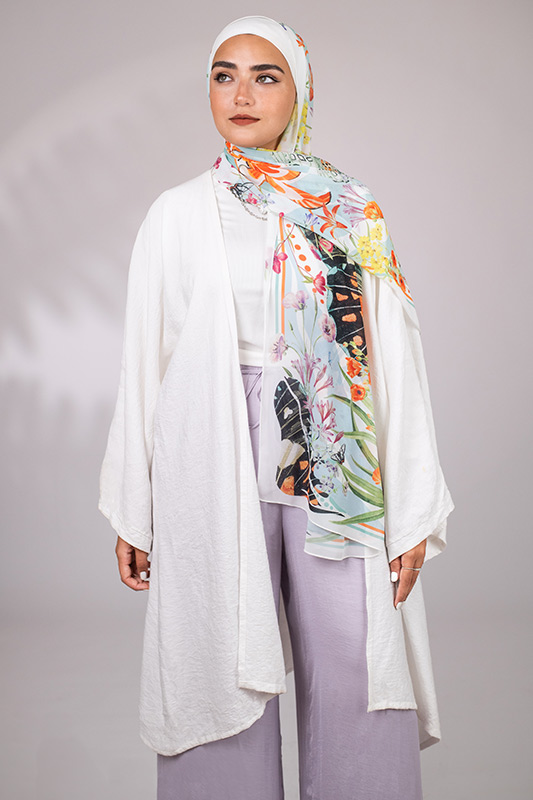 If you’re not in the mood for a skirt or a dress, you can style a pair of loose pants with a flowy cardigan, like EMMA’s model here. In fact, you can create this exact same outfit if you decide to get Farfalla, the featured hijab.
