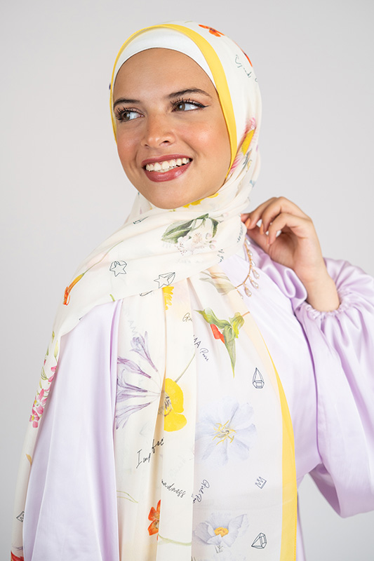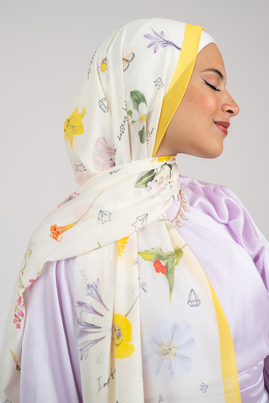 In this summer collection we’ve designed a scarf that’s all about bright yellow, and that’s Soleil. With a flashing border that pops out the details of the whole scarf and outfit.