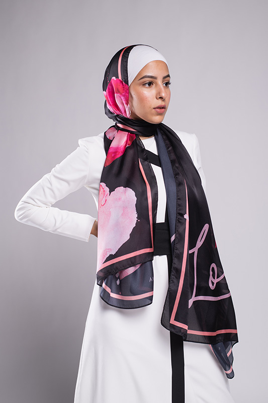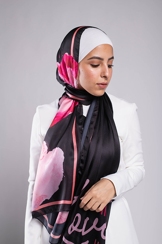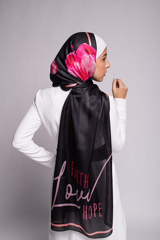 ❤️ Wear your faith with pride! A classic favorite with an edgy modern twist, watercolored fuscia hearts on a jet black satin with the words Faith, Love, Hope. A scarf celebrating your modesty ❤️