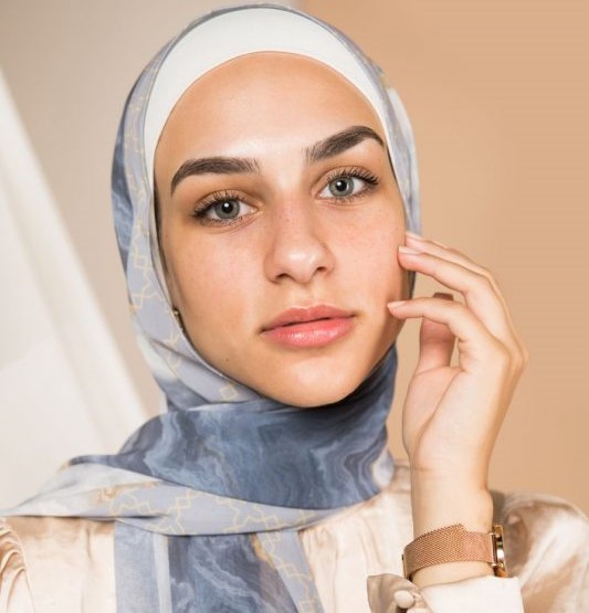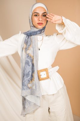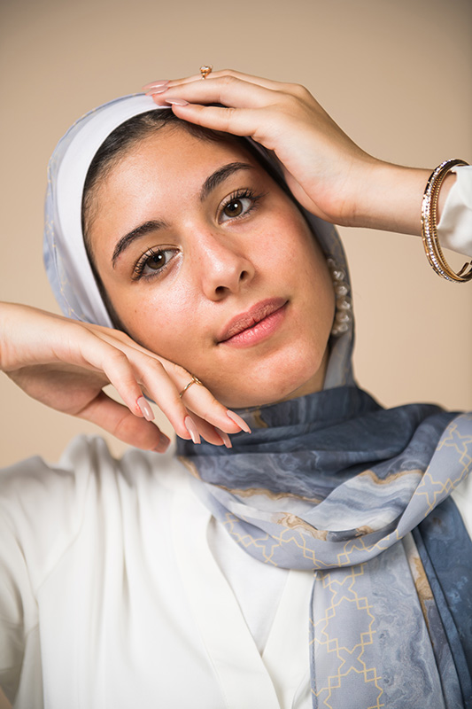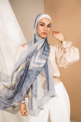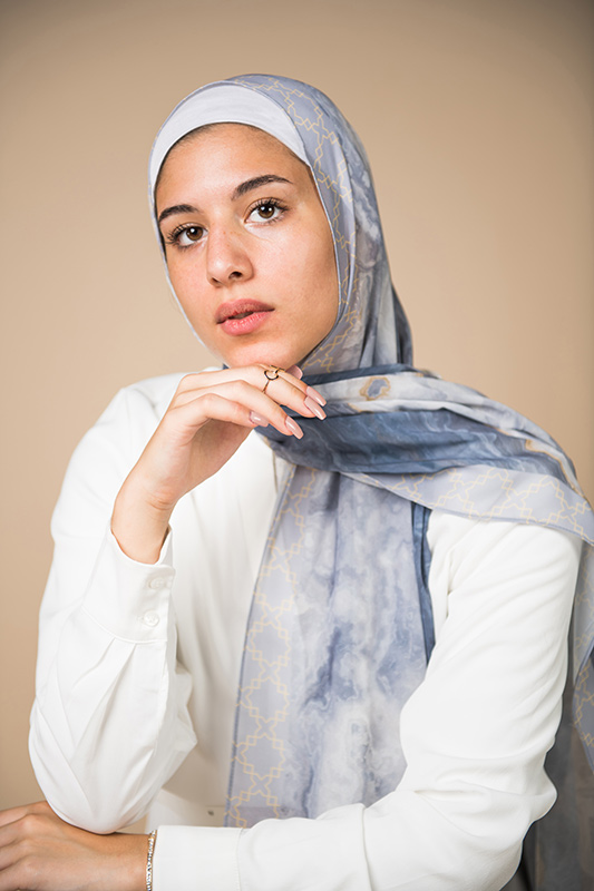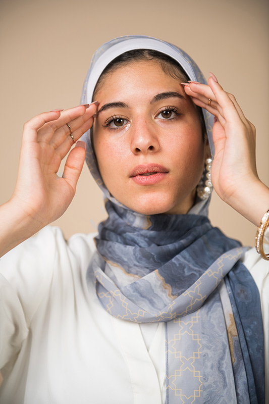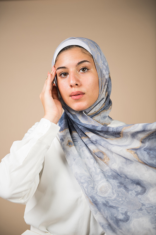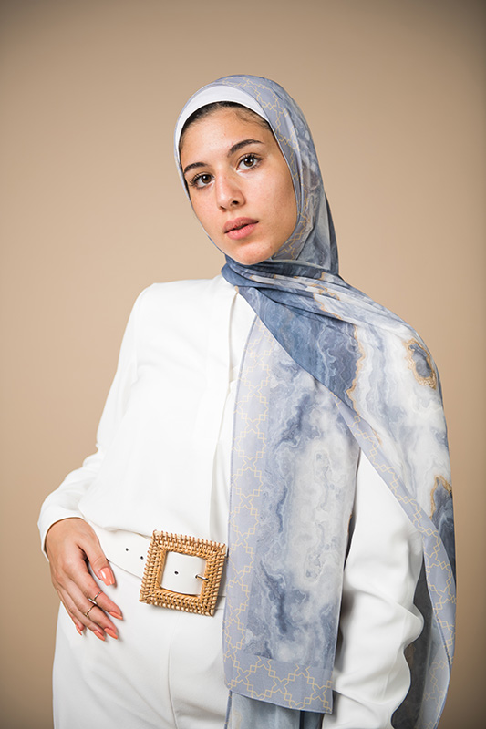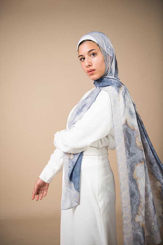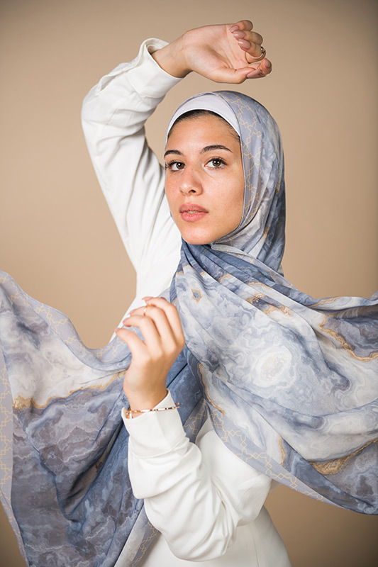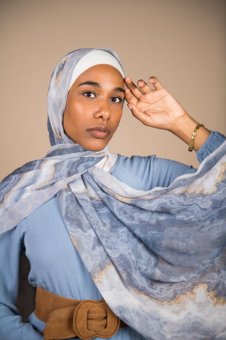 Natural Geode pattern, merging the richness of petroleum color with a hint of gold, in an Islamic arabesque border that’s minimally chic. A scarf that will elevate your outfit to the next level.
